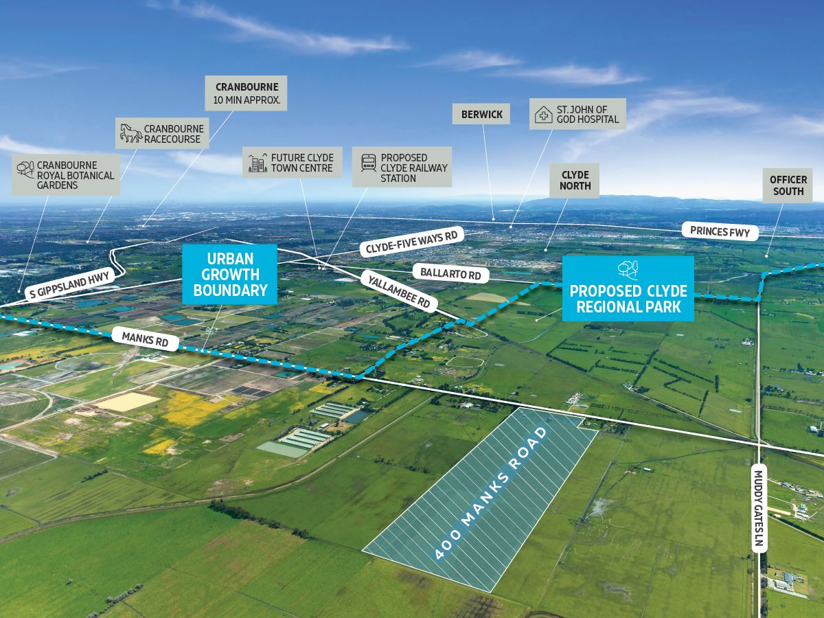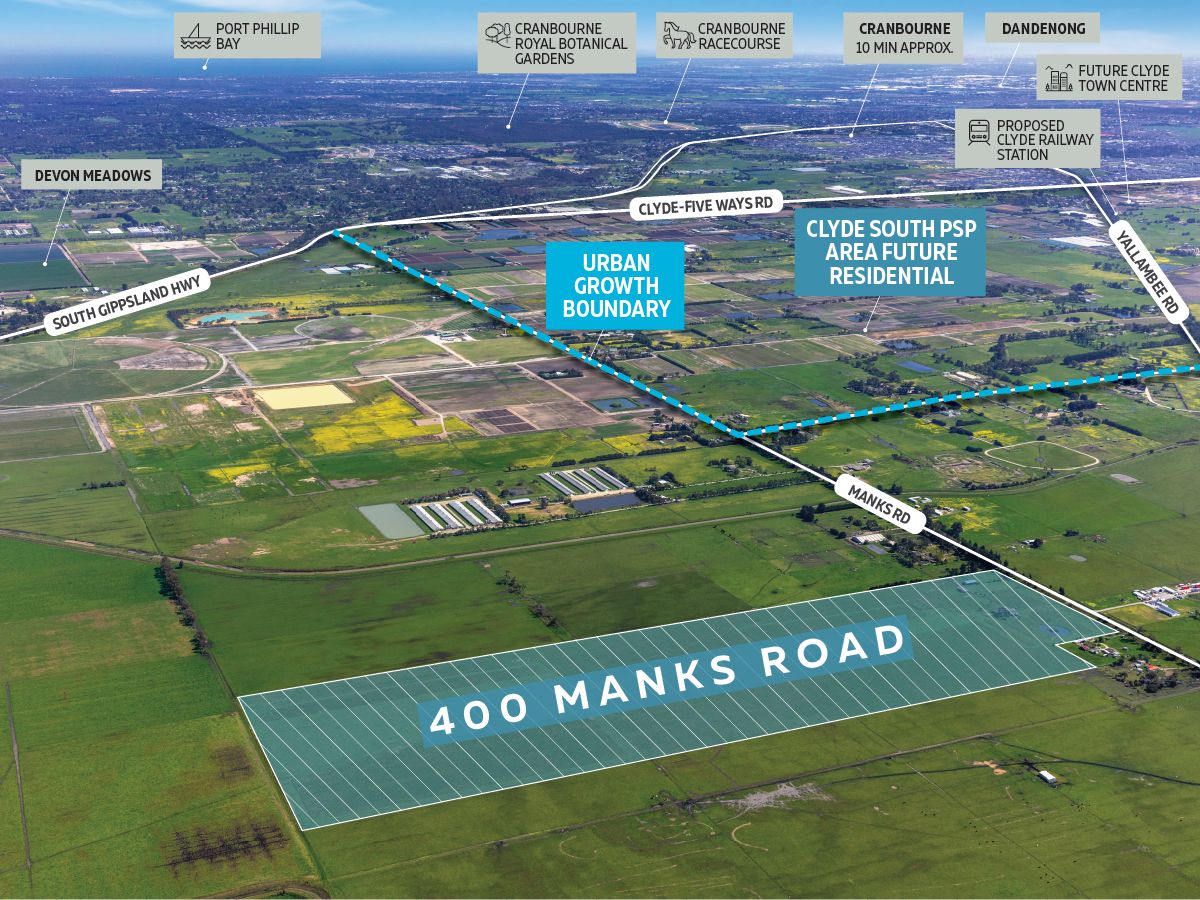 Biggin & Scott Land and O'Brien Real Estate are delighted to offer for sale by Tender, 400 Manks Road, Clyde, a substantial 40 Ha property located on the fringe of Melbourne’s Urban Growth Boundary, ideally positioned to prosper from the future growth to occur in this area.* 40 Ha land area