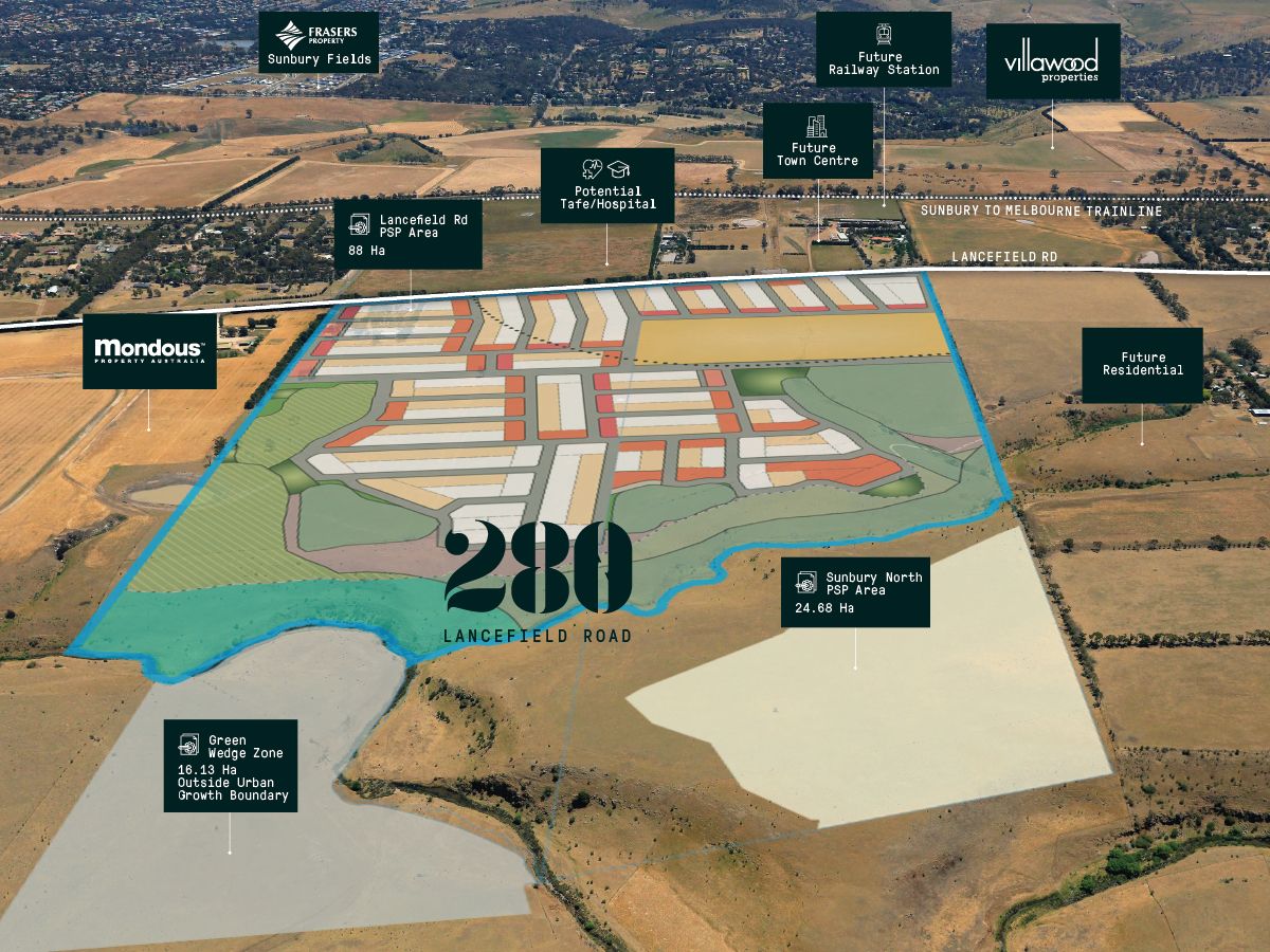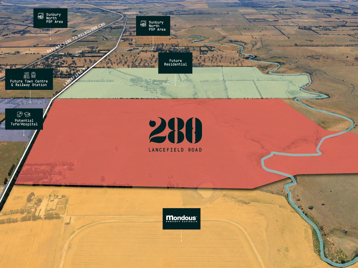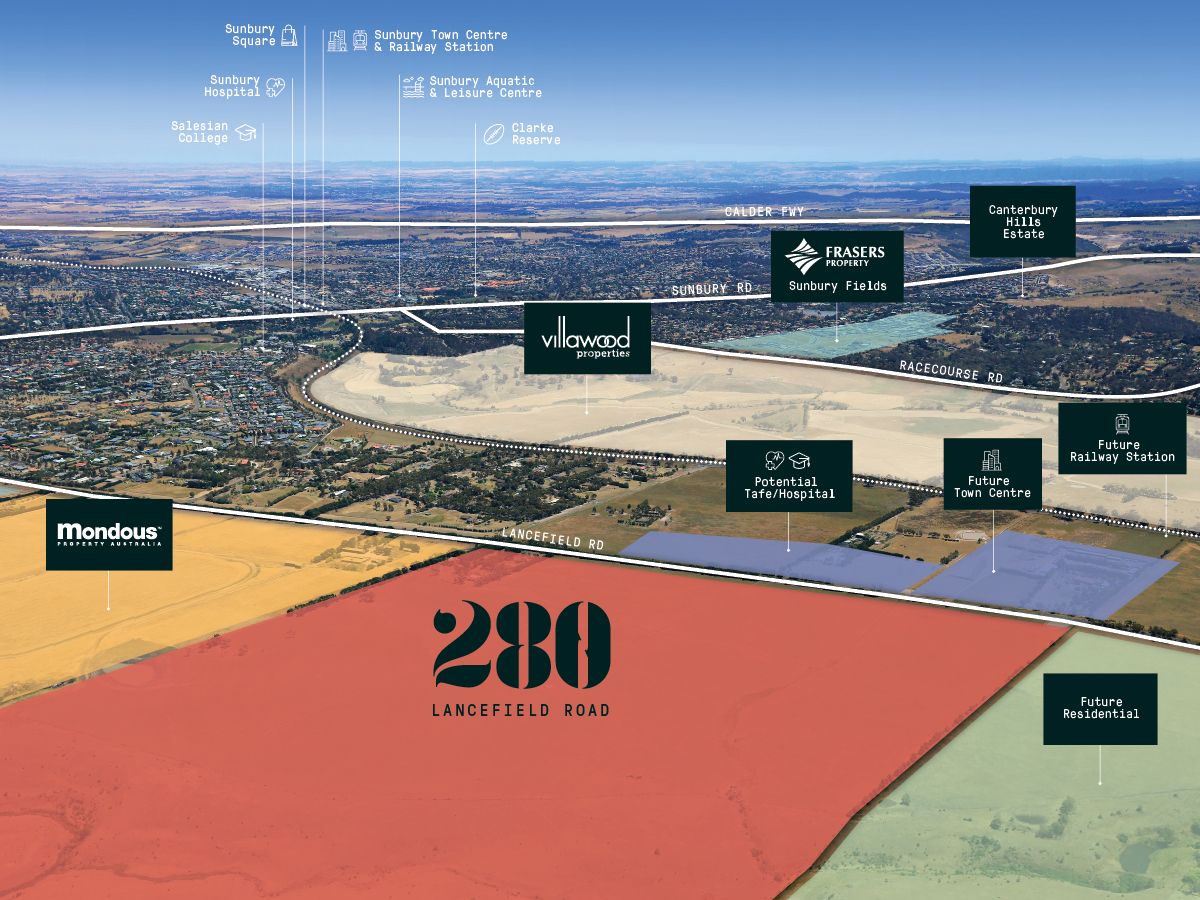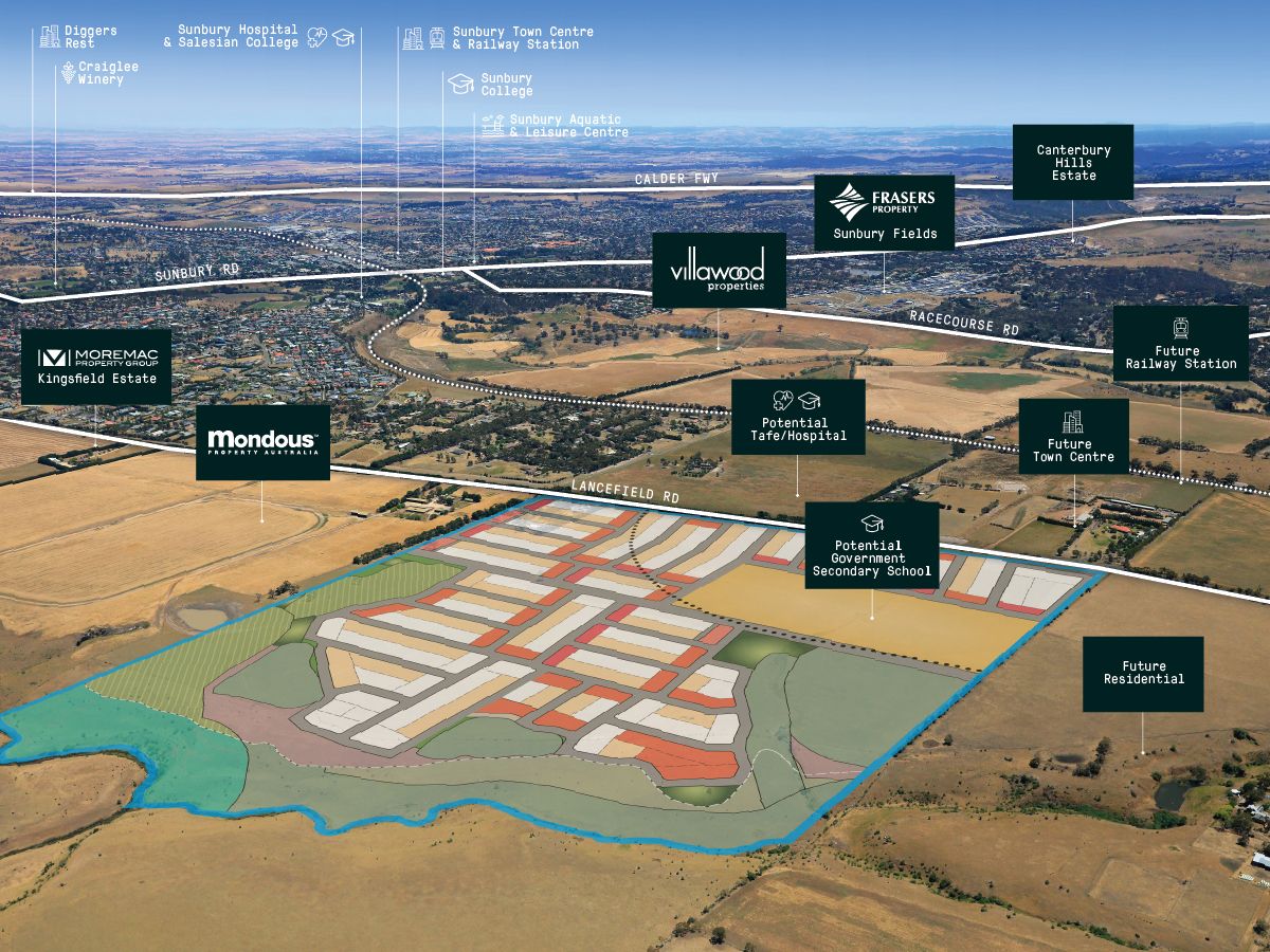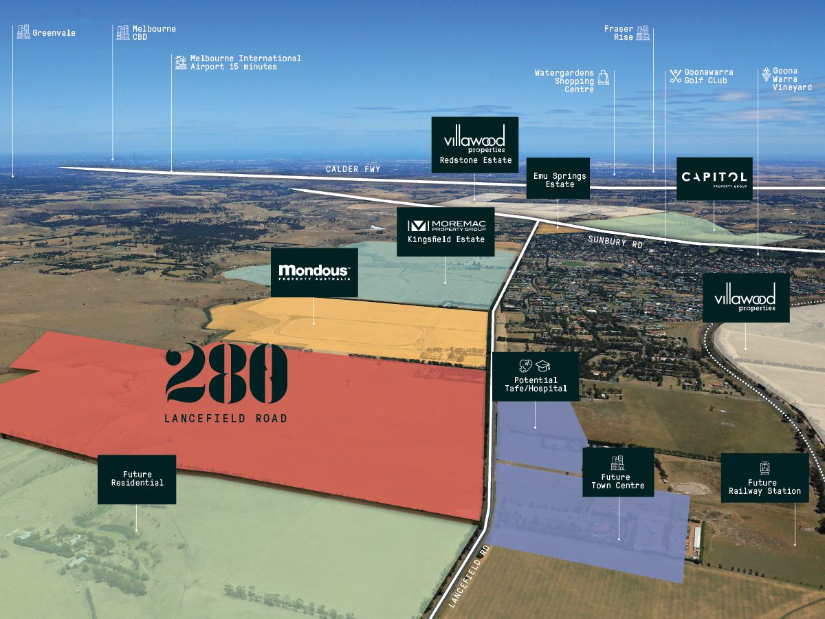 Comprising an ultimate yield of approximately 1100 lots (STPA) including a 8.4 ha government school site. The property is strategically located directly opposite the future Lancefield Rd Town Centre which providing up to 10,000 m2 of retail space, a future railway station within walking distance and a potential Hospital/TAFE facility.