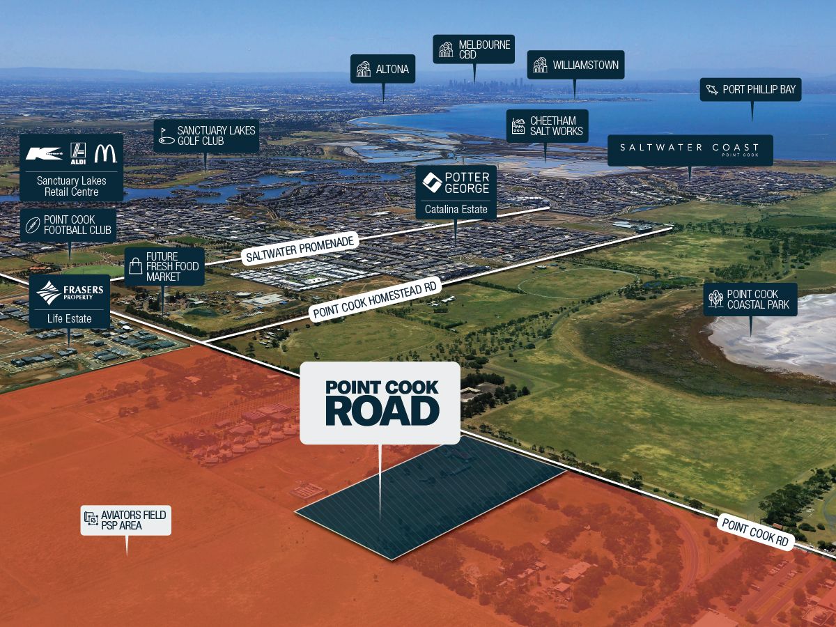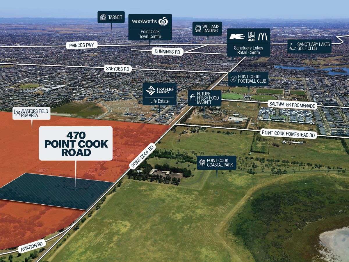 Located approximately 28 kilometres south west from the Melbourne CBD and just 4km from the Point Cook Town Centre, the site forms part of the Aviators Field PSP area and is extremely well located with the future Starr Point fresh food market within walking distance, together with new and existing schools, sporting grounds and a marine coastal park close by.
